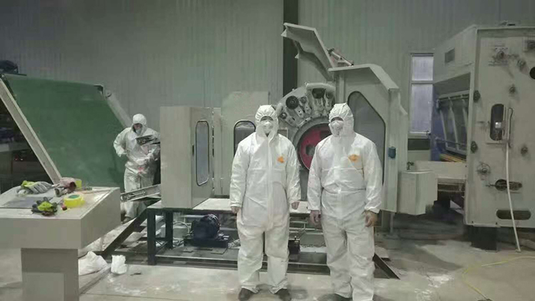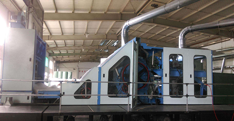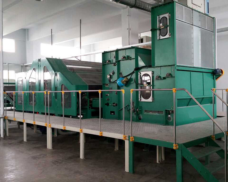 1、用途特點(diǎn):適用于將滌綸、丙綸、維綸、雙組份化學(xué)纖維等纖維高速梳理成網(wǎng)。雙錫林梳理、雙道夫雙雜亂出棉,出棉部分帶有輸出皮簾能迅速轉(zhuǎn)移已剝棉網(wǎng);采用羅拉剝棉;四根喂棉羅拉包纏金屬針布,分上、下二組配對(duì)變頻傳動(dòng),羅拉裝有防金屬保護(hù)裝置,漏底為不銹鋼。所有輥筒經(jīng)定型處理,精密加工而成。徑向跳動(dòng)≤0.05mm。